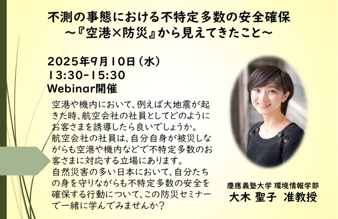 3日目の午後には、慶應義塾大学 環境情報学部の大木聖子准教授による特別セミナー「不測の事態における不特定多数の安全確保 ―『空港×防災』から見えてきたこと―」が開催されました。大木准教授は、空港での防災演習や学校での訓練事例を紹介しながら、災害時に「避難すべきか、その場にとどまるべきか」を即座に判断し、スタッフ一人一人が持ち場でリーダーシップを発揮する重要性を強調されました。学生に加え、約200名の社員がオンラインで参加し、航空安全と防災を結びつけて学ぶ貴重な機会となりました。