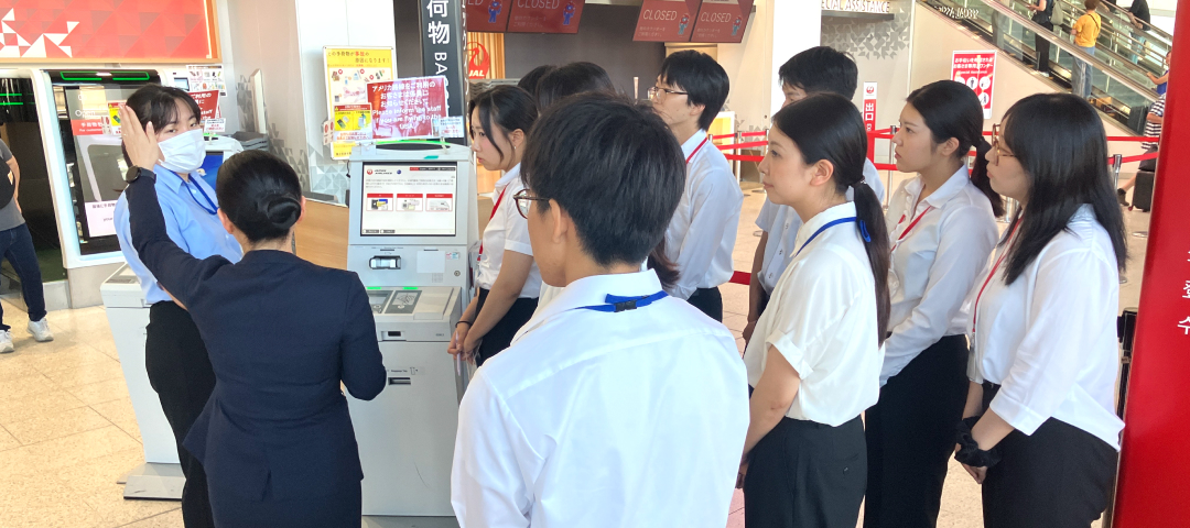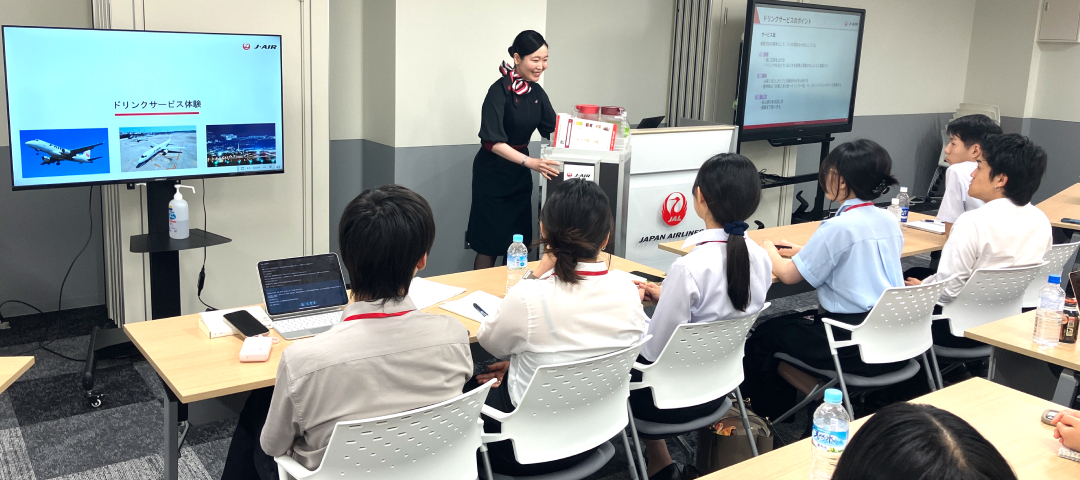 今回の研修では、JALグループの各部門の担当者が講義を担当し、企業紹介や空港見学、サービス体験といった実践的な内容に加えて、大阪・関西万博に向けた取り組みについても紹介しました。