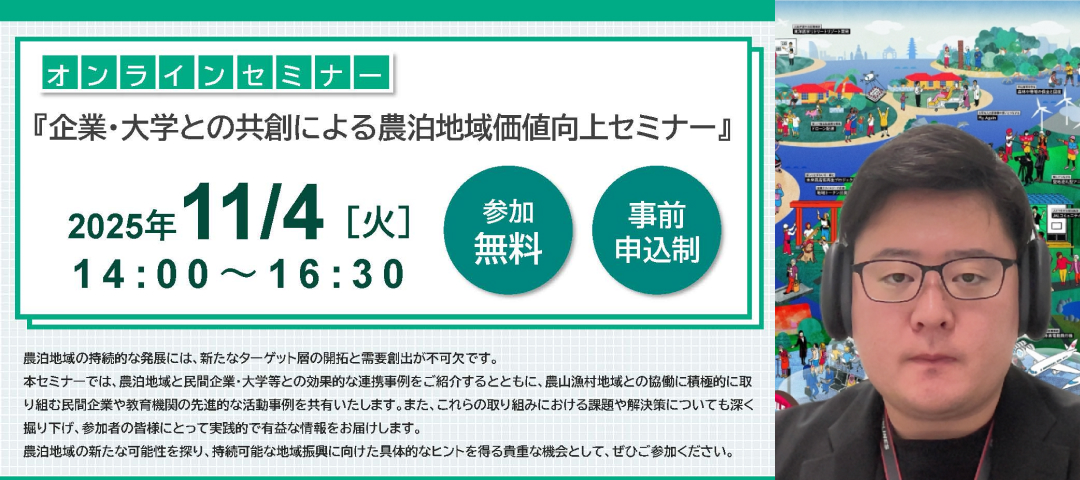 2025年11月4日、株式会社JTB主催のオンラインセミナー「企業・大学との共創による農泊地域価値向上セミナー」において、株式会社JAL航空みらいラボ 航空事業調査研究部 調査研究員の上入佐慶太が、事例紹介およびパネルディスカッションに登壇しました。本セミナーは、農泊地域と民間企業・大学などとの効果的な連携事例や、農山漁村地域との協働に積極的に取り組む先進的な活動を共有し、持続可能な地域振興に向けた具体的なヒントを探ることを目的に開催され、当日は農泊地域の行政関係者や地域事業者など約40名の皆さまにご参加いただきました。