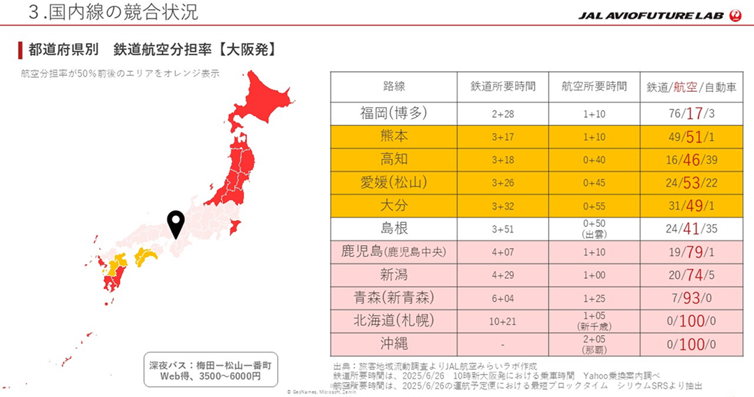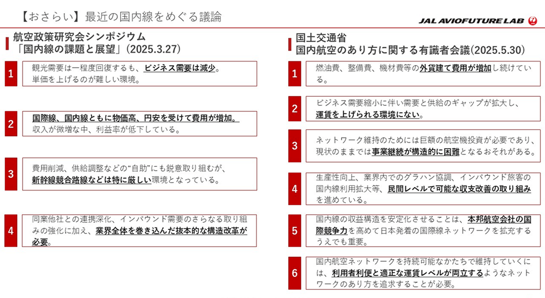 取締役調査研究部長の岩﨑からは、「国内線を取り巻く環境」の講演を行いました。昨今、本邦航空会社の国内線事業はさまざまな要因により収支が厳しいと報じられています。今回のセミナーでは、最近の有識者会議での議論を振り返り、大手二社と米国航空会社の国内線事業の事業構造を比較し、国内線事業にどのような変化が起きているかを論じました。また、日本国内における鉄道との競合や航空利用率の分析も行っております。結びでは、航空ネットワークの維持に向けて、より航空の強み(速達性)を活かすには何が求められるのか?長距離路線の充実、他交通モードも含めた協調・協力の推進、国・地域による補助のあり方、規制緩和などを他業界・他国事例も参考にしながら早急に検討するべきと示唆を述べています。