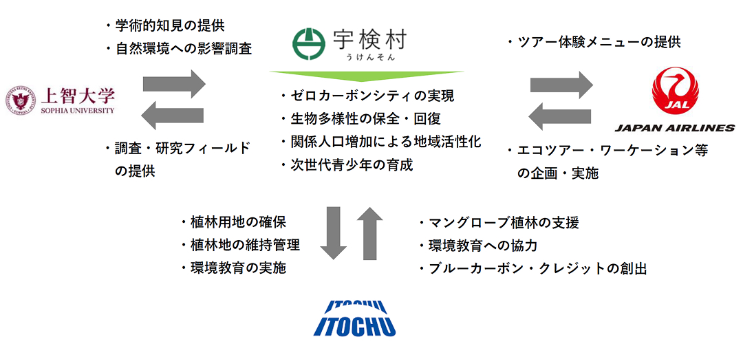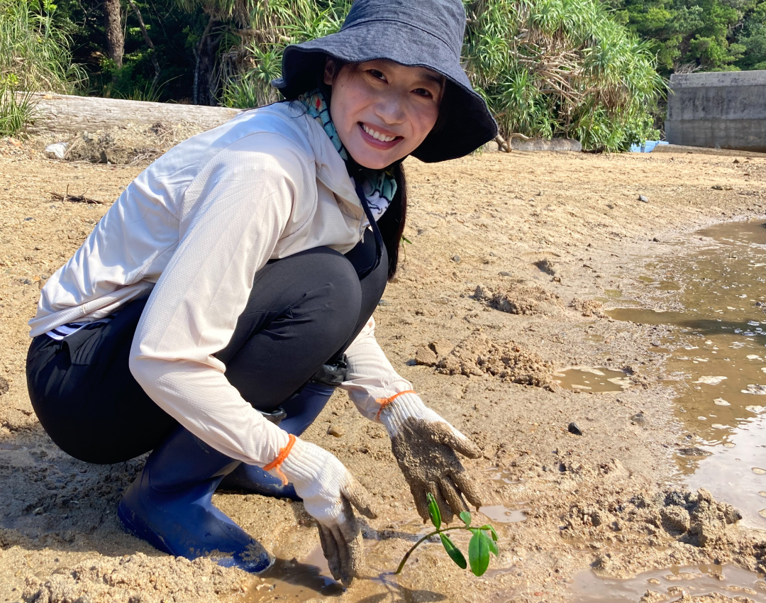 奄美大島は2021年に世界自然遺産に登録されており、宇検村はその一角を占めています。宇検村と伊藤忠商事は、そのかけがえのない自然を守っていく取り組みとしてマングローブ植林を進めています。マングローブは「海のゆりかご」とも呼ばれ、多様な生物の生息地となり、生物多様性の保全に大きく貢献しています。また、マングローブは土壌中に多量の炭素を隔離し、大気中のCO2を吸収・固定する「ブルーカーボン」としても注目されています。