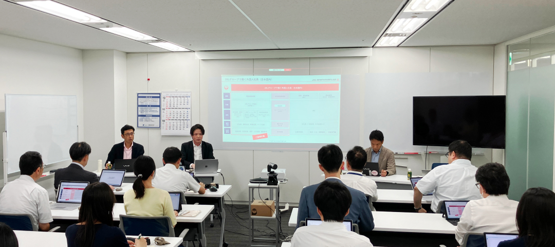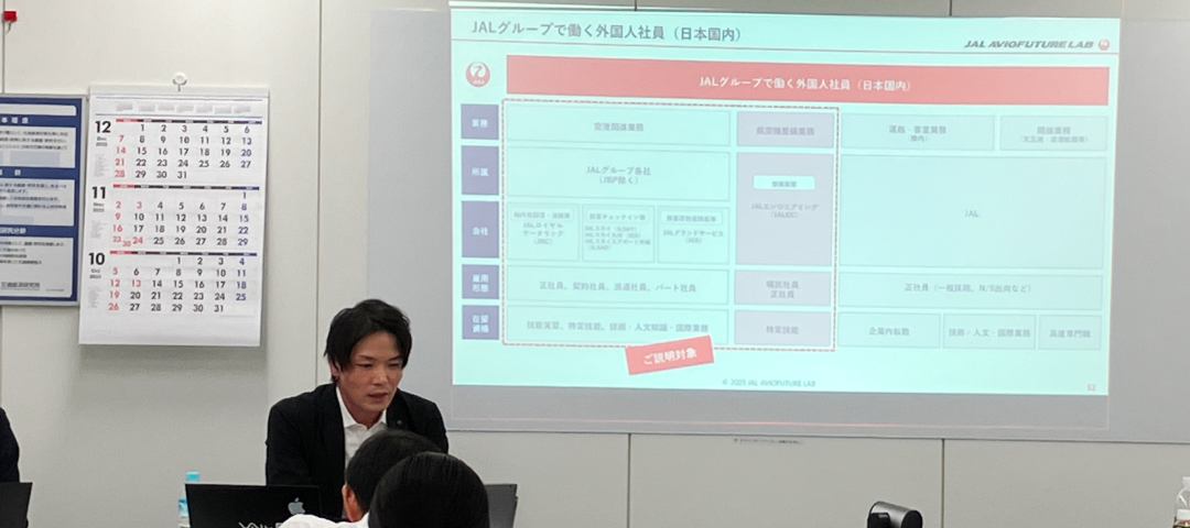 航空事業調査研究部 上席調査研究員の中島卓哉からは、これまでの日本の外国人政策の変遷や足元の政策動向などについて説明し、JALグループにおける外国人社員の状況や抱えている課題についても紹介しました。交通経済研究所との意見交換では、外国人財の活用における鉄道業界と航空業界の連携の可能性や、外国人財に選ばれる国となるために必要な政策などについて、活発な議論が交わされました。